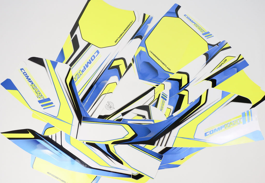 To fit the OTK M6 nose cone & nassau, FL EVO side pods and KG clob rear bumper. The kit also includes fuel tank & chain guard stickers.
